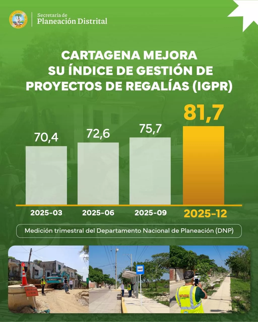 El repunte continúa: Cartagena sube a 81,7 en el Índice de Gestión de Proyectos de Regalías