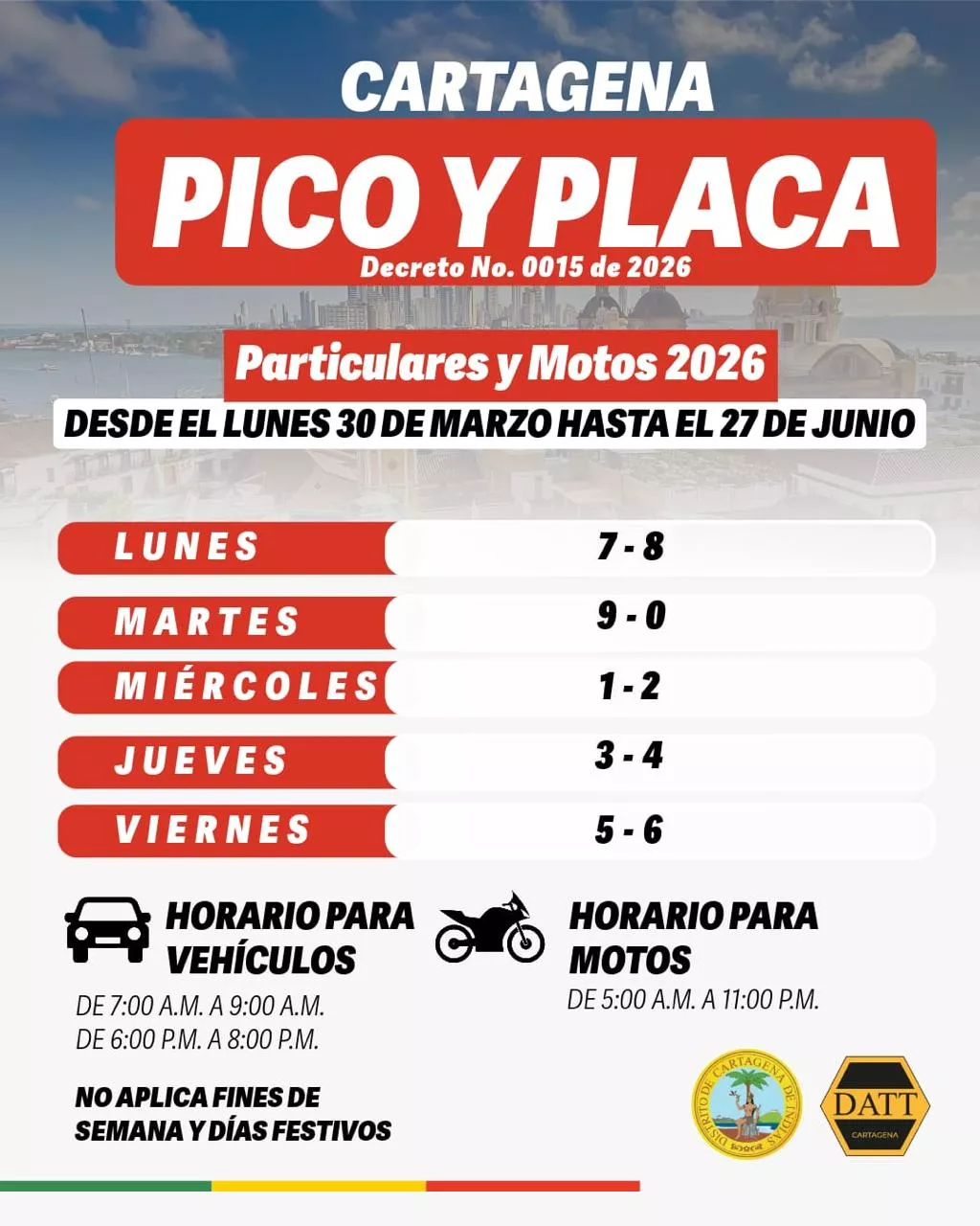Cambia la rotación de pico y placa para motos y vehículos particulares en Cartagena