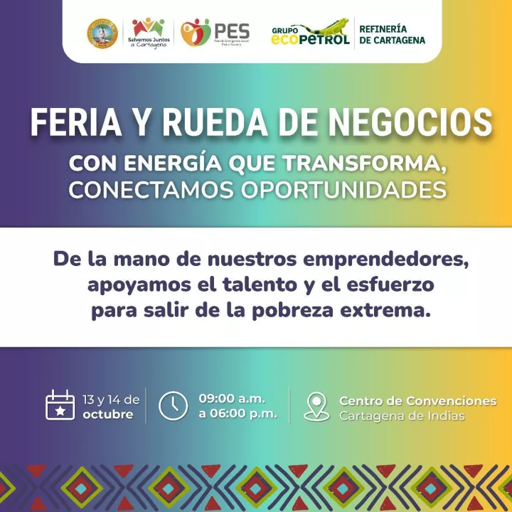 Cartagena de Indias, D. T. y C. 11 de octubre de 2023. Bajo el lema “Con energía que transforma, conectamos oportunidades”, la Alcaldía de Cartagena, el Grupo Ecopetrol y la Refinería de Cartagena realizarán el 13 y 14 de octubre la Feria y Rueda de Negocios PES Pedro Romero - Ecopetrol, en el Centro de Convenciones de Cartagena.