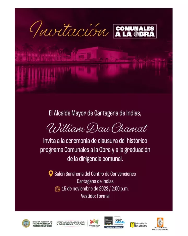 Por lo anterior, la Alcaldía de Cartagena le extiende una cordial invitación a los periodistas de la ciudad para que asistan al evento de cierre del proyecto "Comunales a la Obra" y graduación de los diplomados, en alianza con la Universidad de San Buenaventura y la Universidad de Los Andes. Evento que se realizará mañana, miércoles 15 de noviembre, en el Centro de Convenciones de 2:00 a 7:00 p.m.