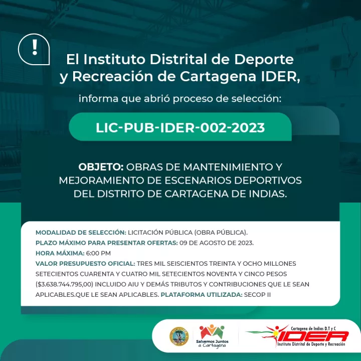 Se trata del proceso de selección LIC-PUB-IDER-002-2023, cuyo pliego de condiciones fue publicado el 30 de junio en el portal de contratación estatal Secop II, y que tendrá una inversión global de $3.638.744.795, bajo la modalidad de sistema de precios unitarios fijos sin fórmula de reajuste.