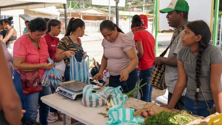 Desde las seis de la mañana, los residentes de sectores cercanos a la Ciénaga de La Virgen acudieron a las plazas móviles, instaladas simultáneamente en la cancha sintética de La María y en el Polideportivo Omaira Sánchez de La Candelaria, para comprar productos frescos, nutritivos y a bajo precio.