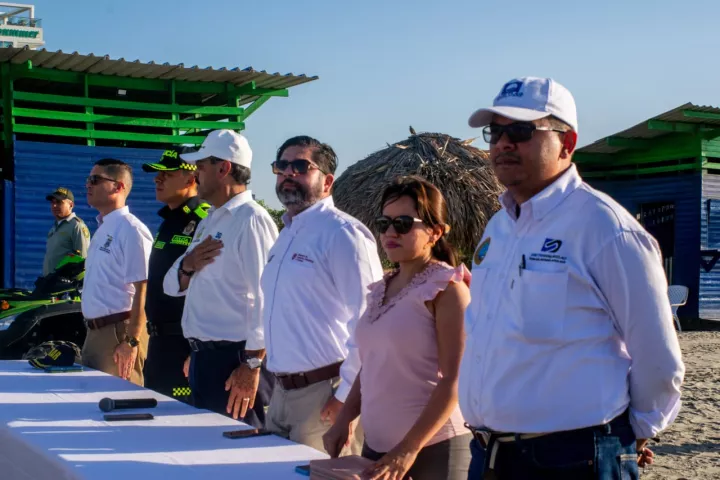 Cartagena de Indias D.T y C; 02 de diciembre de 2023. Distriseguridad izó la bandera Blue Flag en Playa Azul La Boquilla, en una ceremonia en la que el director de Distriseguridad, Luis Enrique Roa Merchán, entregó a la comunidad oficialmente el galardon que ratifica esta Playa con este reconocimiento.