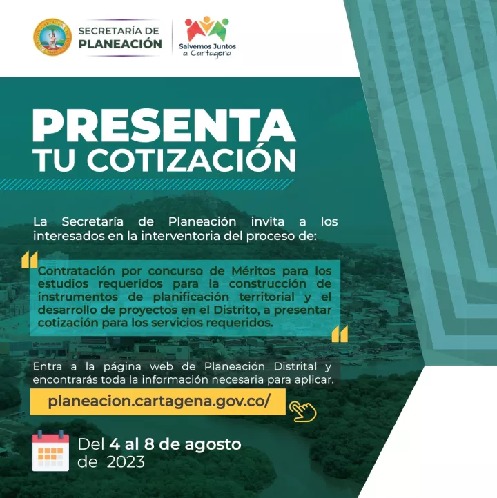 Cartagena de Indias D. T. y C; 04 de agosto del 2023. La Alcaldía de Cartagena, a través de la Secretaría de Planeación, invita a los interesados en realizar los levantamientos topográficos y la interventoría por concurso de méritos para los Planes Parciales y la legalización urbanística que se está desarrollando en varios sectores de la ciudad a presentar cotizaciones para el producto referido.