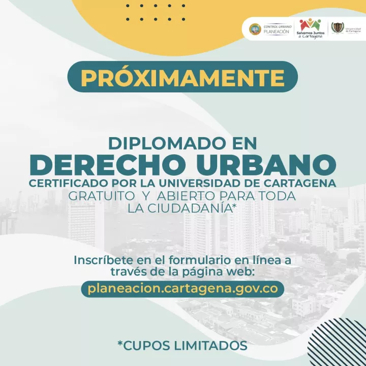 Cartagena de Indias D. T. y C., 16 de noviembre de 2022. La Secretaría de Planeación Distrital, a través de la Dirección Administrativa de Control Urbano, y la Universidad de Cartagena, invitan a líderes comunitarios, profesionales de control urbano, funcionarios de la Alcaldía de Cartagena y a la ciudadanía en general, a participar en el proceso de preinscripción para cursar Diplomado en Derecho Urbano; el cual tiene como objetivo fortalecer sus capacidades y ampliar conocimientos en reglamentación urbana con enfoque en planeación del territorio, así como los retos que presenta el nuevo contexto histórico de la ciudad.