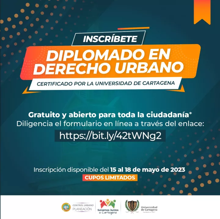 Cartagena de Indias D. T. y C; 15 de mayo de 2023. La Secretaría de Planeación Distrital, a través de la Dirección Administrativa de Control Urbano, habilita las inscripciones para el segundo Diplomado en Derecho Urbano, el cual será certificado por la Universidad de Cartagena. Es una oferta académica abierta a toda la ciudadanía, pueden participar líderes comunitarios, profesionales de control urbano, funcionarios de la Alcaldía de Cartagena o cualquier ciudadano interesado en formarse en normas urbanísticas.