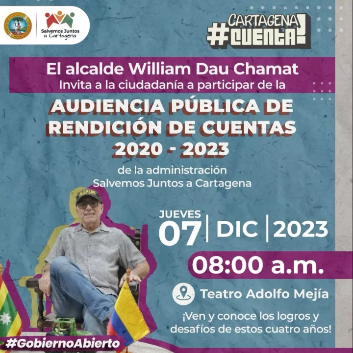 Cartagena de Indias D. T. y C; 06 de diciembre de 2023 El alcalde de Cartagena, William Dau Chamat, presentará a la ciudad y al país los resultados de su gobierno, correspondiente al cuatrienio 2020-2023, con el propósito de cumplir con la responsabilidad del Estado de rendir cuentas y garantizar el derecho de la ciudadanía del control social a la gestión pública.