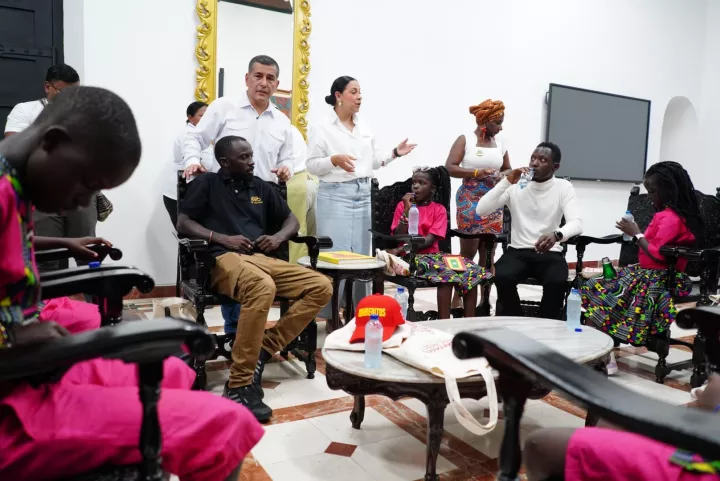El alcalde Mayor, Dumek Turbay, reafirmó el compromiso humanitario de costear sus pasajes en un encuentro con los niños bailarines de Uganda, en el Palacio de La Aduana.