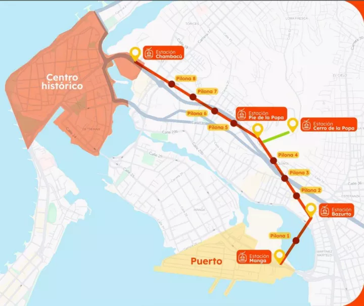 Kalamarí también comunicará la zona de cruceros de Cartagena con el Complejo Deportivo Nuevo Chambacú y el Centro Histórico, por medio de estaciones intermedias ubicadas en el entorno del mercado de Bazurto y en el Pie de La Popa.