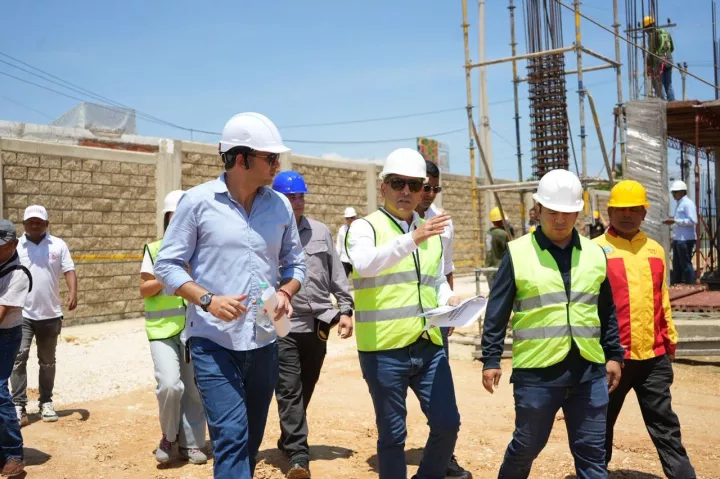 Cartagena de Indias D. T. y C., 26 de junio de 2025. El alcalde Mayor de Cartagena, Dumek Turbay Paz, en compañía del director del Cuerpo de Bomberos de la ciudad, Jhony Pérez Sayas, y miembros del gabinete distrital, llevaron a cabo una visita de inspección a las obras de construcción de la nueva Estación de Bomberos en Bocagrande, donde se evidenció un avance de más del 25% en su ejecución.