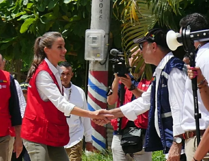 Cartagena de Indias D. T. y C; 13 de junio de 2023. El alcalde de Cartagena, William Dau Chamat, junto al Secretario General del Distrito, Carlos La Rota, y la Gestora Social, María Angélica Klee, acompañaron a la Reina de España, doña Letizia Ortiz Rocasolano, a un recorrido en el barrio Villa Hermosa, con el fin de revisar y visibilizar el funcionamiento de la planta potabilizadora de El Bosque. El recorrido inició en el Instituto Educativo Metropolitano de Cartagena, lugar en el que fueron recibidos con bailes y actividades culturales por parte de los estudiantes.