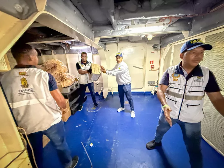 La misión inició este viernes a las 5:00 a.m. desde el buque A.C.R. Golfo de Urabá de la Armada Nacional, transportando toneladas de ayudas humanitarias: alimentos, kits de mercado, láminas para techos, cemento e insumos esenciales para la recuperación de las familias damnificadas.