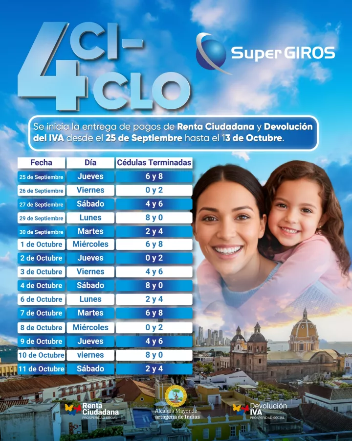 Cartagena de Indias, D.T. y C., 24 de septiembre de 2025. La Alcaldía Mayor de Cartagena informa a la comunidad que Prosperidad Social realizará los pagos de los programas Renta Ciudadana y Devolución del IVA del 25 hasta el 13 de octubre. Siendo este el cuarto ciclo del año para los hogares que reciben en modalidad de giro.