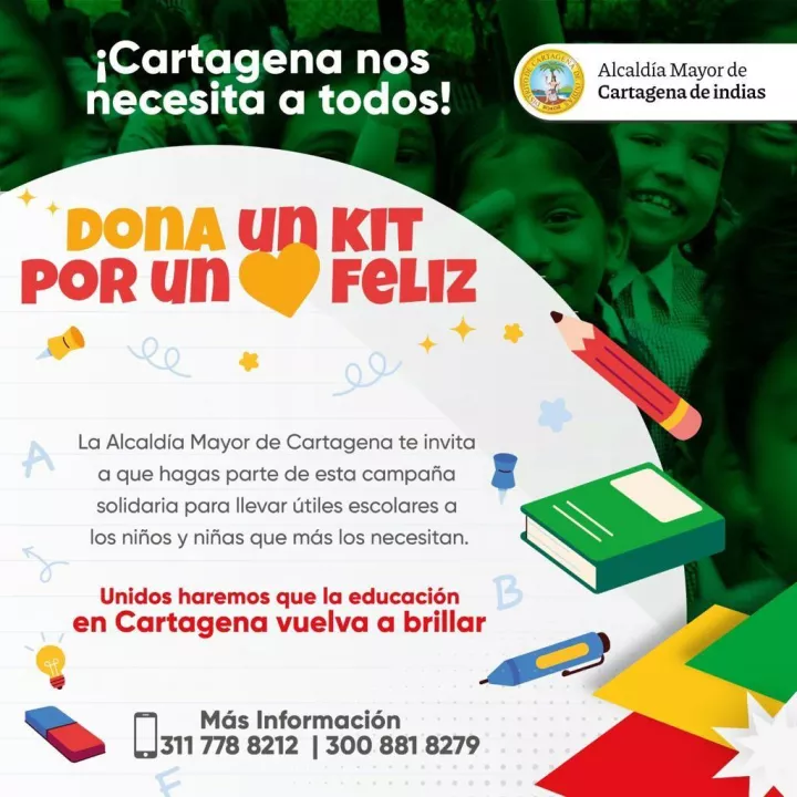 Cartagena de Indias D. T. y C., 10 de enero de 2024. La educación de los niños y niñas es prioridad. Por esta razón, desde la Alcaldia de Cartagena se ha puesto en marcha una campaña solidaria “Dona un kit, por un corazón feliz”.