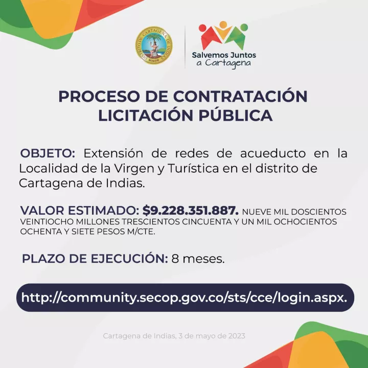 Cartagena de Indias D. T. y C; 04 de mayo de 2023. El Distrito Turístico y Cultural de Cartagena de Indias inicia convocatoria para seleccionar el proveedor para el proyecto de “EXTENSIÓN DE REDES DE ACUEDUCTO EN LA LOCALIDAD DE LA VIRGEN Y TURISTICA.”