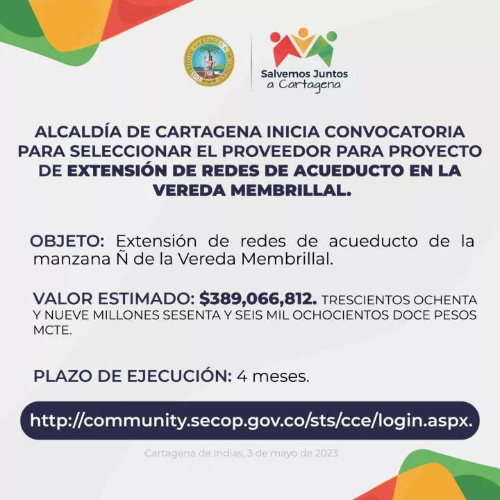 Cartagena de Indias D. T. y C; 04 de mayo de 2023. El Distrito Turístico y Cultural de Cartagena de Indias inicia convocatoria para seleccionar el proveedor para el proyecto de “EXTENSIÓN DE REDES DE ACUEDUCTO DE LA MANZANA Ñ DE LA VEREDA MEMBRILLAL”. El desarrollo de este proyecto, se estima que beneficiará, aproximadamente, a 108 viviendas de la vereda Membrillal que contarán con agua potable, mejorando así su calidad de vida y bienestar, cumpliendo con este derecho básico que les permite el acceso a una vida digna.