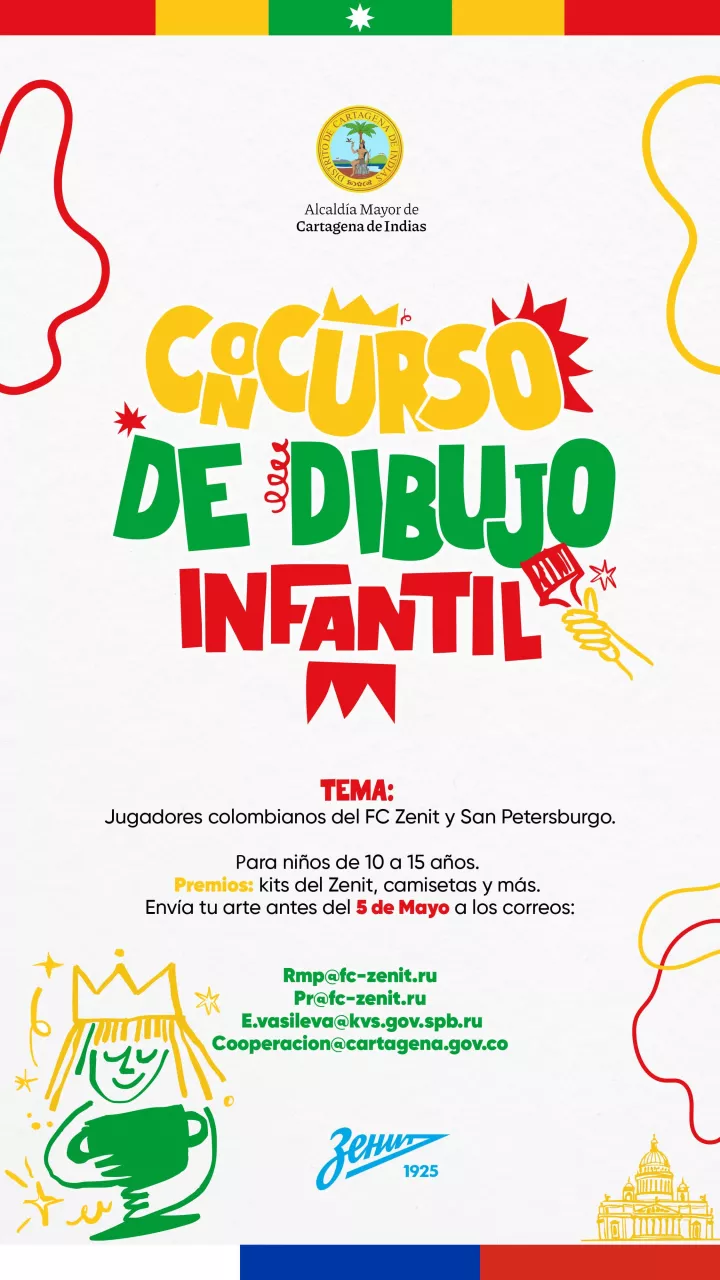 El concurso, dirigido a estudiantes entre los 10 y 15 años, propone como tema central: “Los jugadores colombianos del Club Zenit y las atracciones de San Petersburgo”. El objetivo es que los participantes representen, desde su perspectiva artística, a los futbolistas colombianos que integran el equipo ruso, combinándolos con monumentos, paisajes o lugares emblemáticos de la ciudad de San Petersburgo.