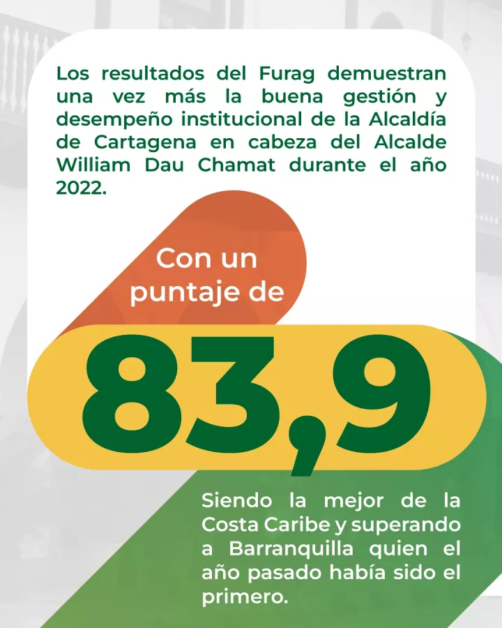 Cartagena de Indias D.T y C; 27 de octubre de 2023. Los resultados del Formulario Único Reporte de Avances de la Gestión - Furag - demuestran una vez más la buena gestión y desempeño institucional de la Alcaldía de Cartagena, liderada por el alcalde William Dau Chamat, durante el año 2022, con un puntaje de 83,9 siendo la más alta de la Costa Caribe, superando a Barranquilla que el año pasado había sido la primera.