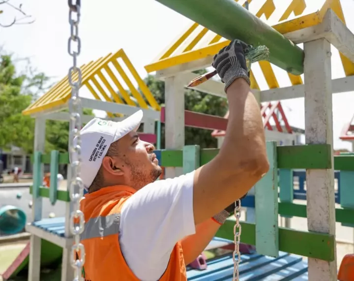Durante la jornada, que inició a las 7 de la mañana, se realizaron acciones de poda controlada, limpieza general y aplicación de pintura en mobiliario infantil y urbano.
