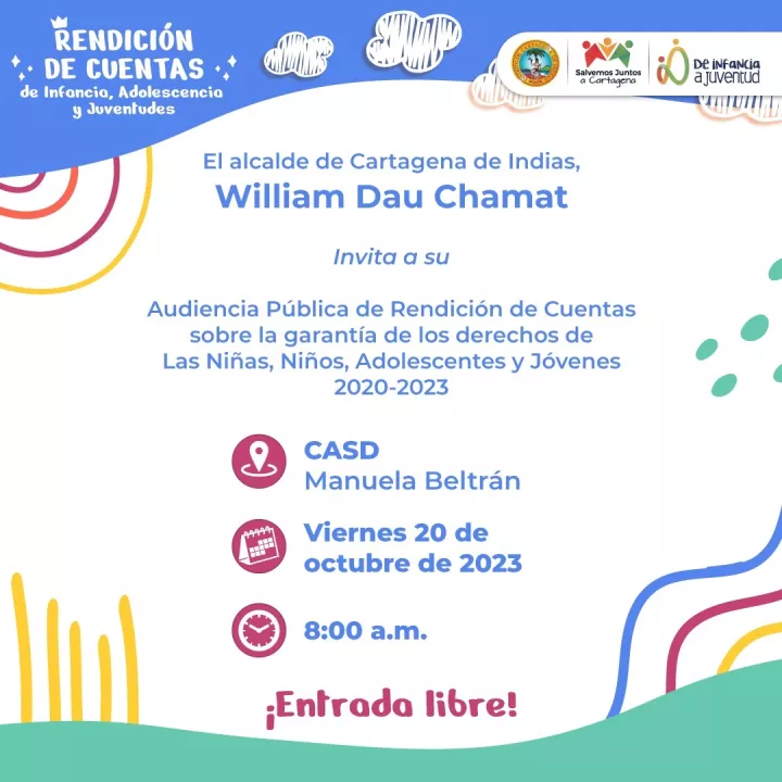 Cartagena de Indias D.T y C; 19 de octubre de 2023. Mañana, viernes 20 de octubre, a partir de las 8 de la mañana, el alcalde de Cartagena, William Dau Chamat, junto con su gabinete Distrital, estarán realizando la Audiencia Pública de la Primera Infancia, Infancia, Adolescencia y Juventudes 2020 - 2023, en las instalaciones del Centro Auxiliar de Servicios Docentes Manuela Beltrán (CASD Manuela Beltrán).