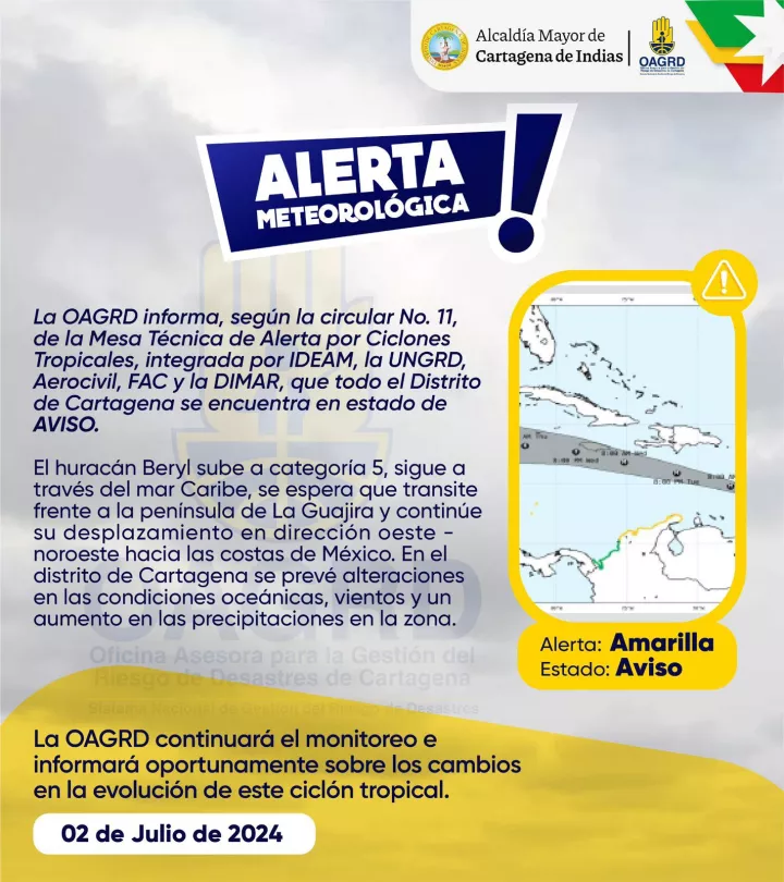 La OAGRD informa, según la Circular No. 11 de la Mesa Técnica de Alerta por Ciclones Tropicales, integrada por el IDEAM, la UNGRD, Aerocivil, la FAC y la DIMAR, que todo el Distrito de Cartagena se encuentra en estado de AVISO.