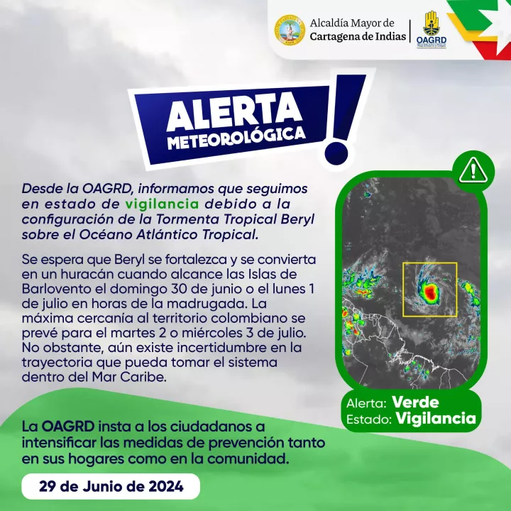 Cartagena de Indias D. T. y C., 29 de 2024z Desde la OAGRD, informamos que seguimos en estado de vigilancia debido a la configuración de la Tormenta Tropical Beryl sobre el Océano Atlántico Tropical.