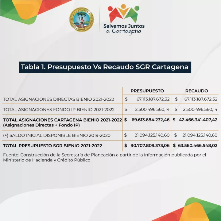 Sobre las asignaciones de recursos del Sistema General de Regalías, indicó que Cartagena ha contado con $90.707.809.373 entre 2021-2022, pero debido a que el recaudo fue menos, solo quedaron disponibles $63.560.466.548 en caja para proyectos.