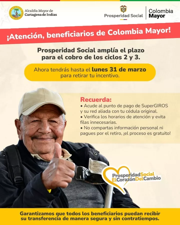 Cartagena de Indias, D. T. y C.; 28 de marzo de 2025. La Coordinadora del Programa de Colombia Mayor, Alejandra Guerra Rico anuncia la *ampliación del plazo* para el cobro de los ciclos 2 y 3. Inicialmente, la jornada estaba prevista para finalizar el viernes 28 de marzo, pero ahora se extenderá hasta el lunes 31 de marzo, con el objetivo de garantizar que todos los beneficiarios puedan acceder a estos recursos.