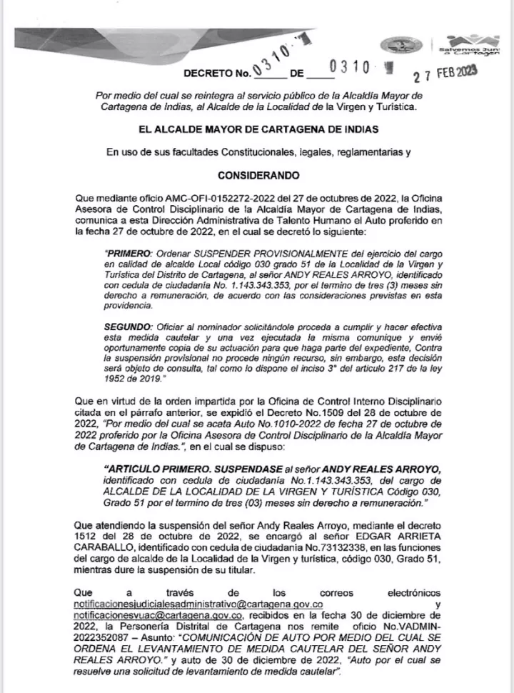 Cartagena de Indias D.T. y C; 28 de febrero de 2023 A través del Decreto 0310 del 27 de febrero de 2023 “por medio del cual se reintegra al servicio público de la Alcaldía Mayor de Cartagena de Indias, al Alcalde de la Localidad de la Virgen y Turística”, Andy Reales Arroyo nuevamente toma posesión del cargo.