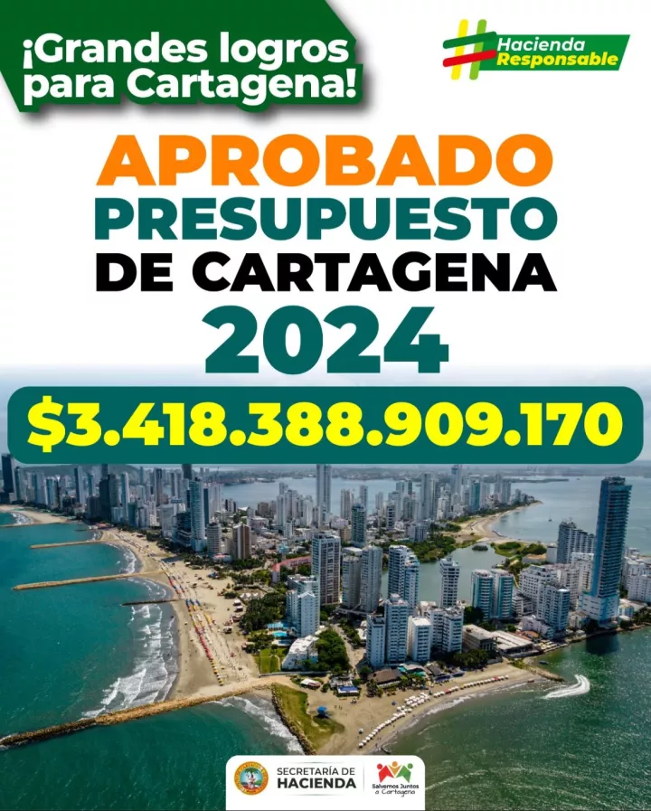 Cartagena de Indias D.T. y C; 07 de diciembre de 2023. Con la aprobación del Concejo, el Presupuesto de Cartagena para el año 2024 quedó establecido en $3.418.388.909.170, un cifra histórica para que la ciudad siga desarrollando sus programas e iniciativas con miras a fortalecer su crecimiento y bienestar.