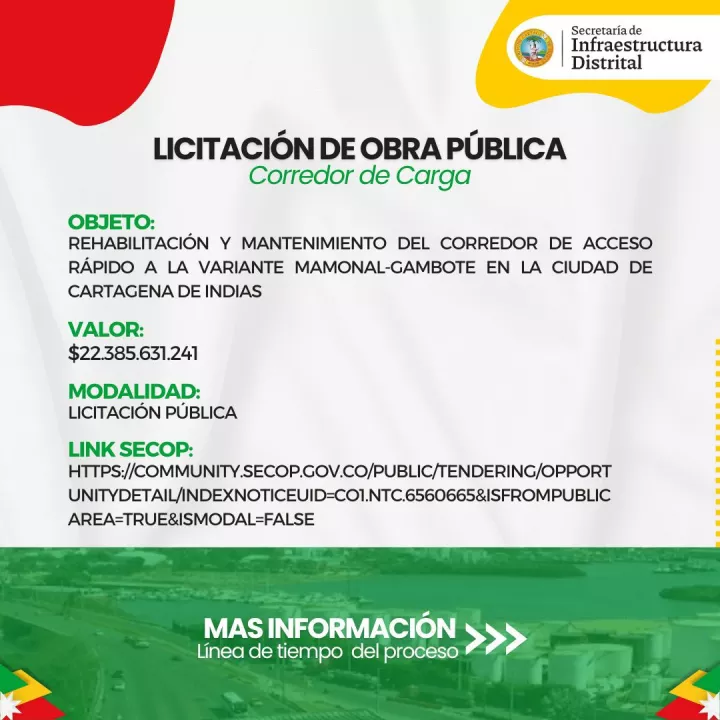 Cartagena de Indias D. T. y C., 4 de septiembre de 2024. La administración del alcalde mayor de Cartagena, Dumek Turbay Paz, rehabilitará tres tramos del Corredor de Carga, lo que corresponde a 16.500 metros cuadrados, incluyendo otros elementos de la carretera, de 20.139 metros cuadrados de pavimento.