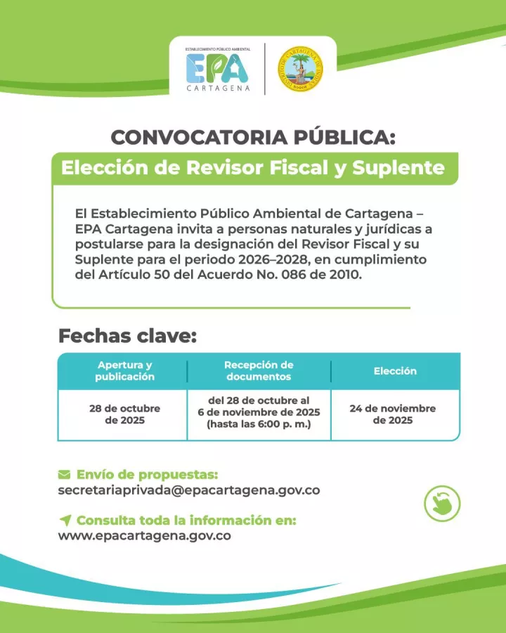 Cartagena de Indias D. T. y C., 28 de octubre de 2025. Desde este 28 de octubre, el Establecimiento Público Ambiental de Cartagena, EPA Cartagena, abrió la convocatoria para la postulación de personas naturales y jurídicas que deseen ocupar el cargo de revisor fiscal y suplente de la entidad para el periodo 2026-2028, en cumplimiento de lo establecido en el artículo 50 del Acuerdo No. 086 del 12 de agosto de 2010.
