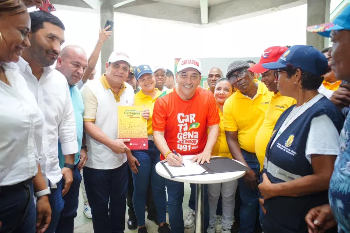 Luego de aprobación unánime del Plan de Desarrollo en el Concejo Distrital, el alcalde mayor de Cartagena, Dumek Turbay Paz, sancionó este importante documento junto a los ciudadanos y la dirigencia cívica y comunal en el sector Barrios Unidos durante un Encuentro Barrial.