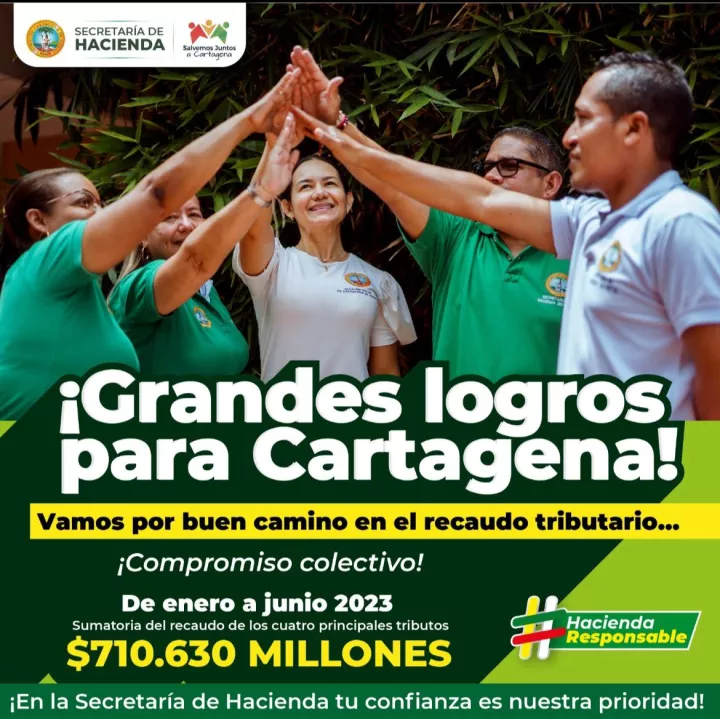 Cartagena de Indias D.T y C; 19 de julio D. T y C. El balance tributario para Cartagena en el primer semestre de 2023 es positivo. De enero a junio, la Secretaría de Hacienda recaudó $710.630 millones por concepto de los cuatro tributos distritales: Impuesto Predial Unificado, Impuesto de Industria y Comercio y Complementarios, Delineación Urbana y Sobretasa a la Gasolina. La cifra representa el 83% de la meta fijada ($856.091 millones) para el recaudo de este año de los impuestos mencionados.