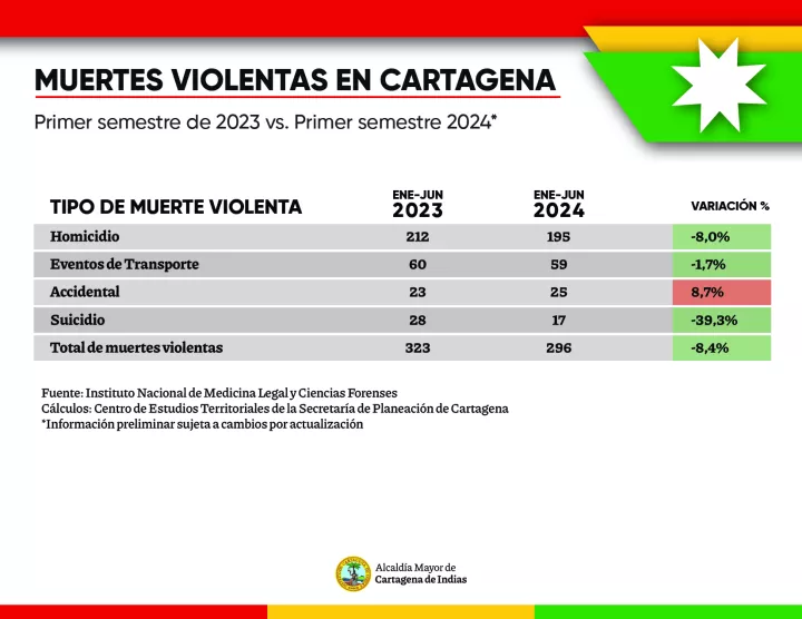Según los datos divulgados por Medicina Legal, en Cartagena se redujeron las muertes violentas en -8,4% y las lesiones no fatales en un -18%. Estos resultados permiten afirmar que Cartagena es la ciudad que logró, durante el primer semestre del año, los mejores resultados dentro de las cinco capitales más pobladas del país.