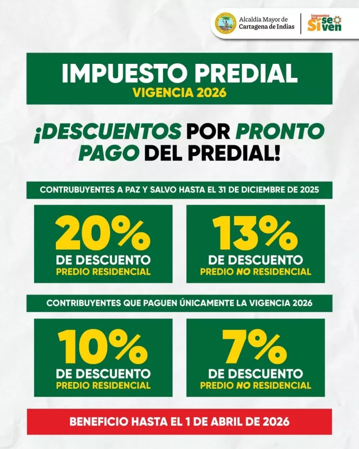 A través del Decreto 2289 del 16 de diciembre de 2025, el alcalde Dumek Turbay Paz estableció que los máximos descuentos por pronto pago del Impuesto Predial Unificado (IPU) aplican hasta el primero de abril de 2026, así: