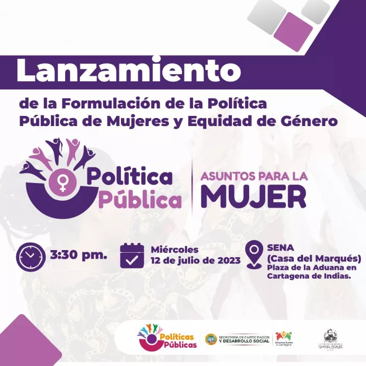 Se invita a todos los medios de comunicación, organizaciones de la sociedad civil y público en general al lanzamiento de la formulación de la Política Pública de Mujeres y Equidad de Género que se realizará el próximo lunes 12 de julio de 2023 en el SENA (Casa del Marqués) a las 4:00 p.m. en la Plaza de la Aduana en Cartagena de Indias. El evento contará con la participación de destacados líderes, expertos y representantes de organizaciones comprometidas con la igualdad de género.