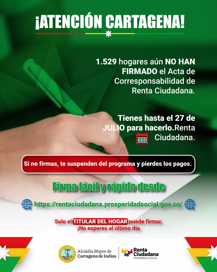 “Hacemos un llamado urgente a estos hogares de Cartagena que aún no han firmado el Acta de compromiso y corresponsabilidad. Este paso es obligatorio para seguir recibiendo Renta Ciudadana. El plazo vence el 27 de julio y no habrá pagos retroactivos para quienes no lo hagan a tiempo”, dijo Guerra.