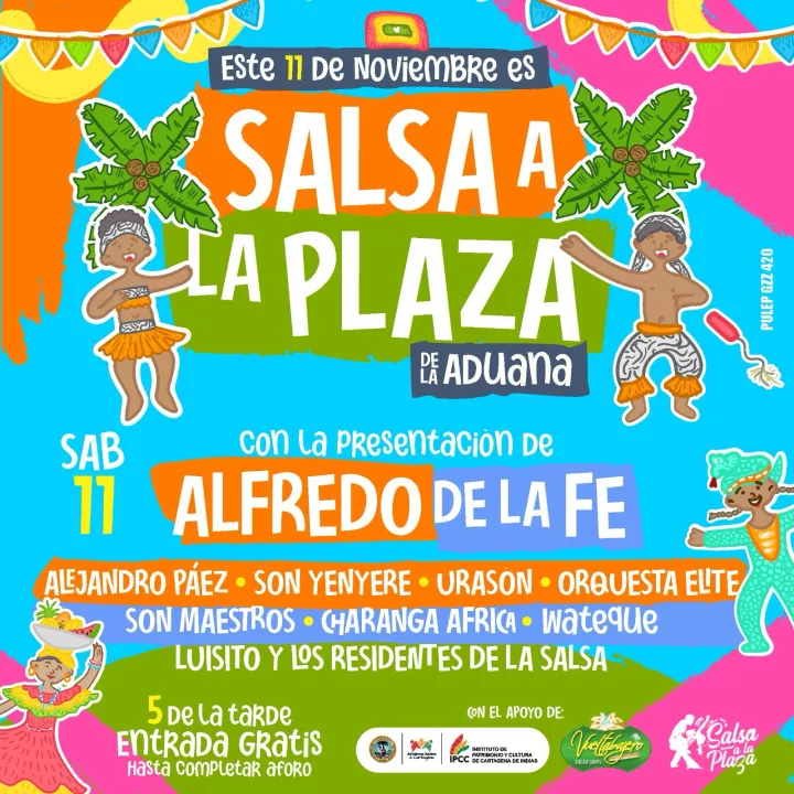 Se trata de Salsa a la Plaza, que se realizará hoy sábado desde las 5:00 de la tarde en la Plaza de la Aduana y se le conoce como la estampa musical del Caribe. Es un evento de la agenda festiva de la ciudad.