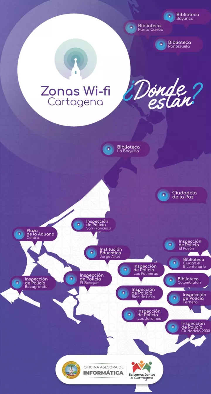Cartagena de Indias D.T y C; 14 de julio de 2023. Cartagena cuenta con 18 Zonas Wi-Fi, que son puntos de acceso gratuito a internet, a las que te puedes conectar en cualquier hora o momento. Estas están distribuidas en diferentes partes de la ciudad. En lo que va del año se han reportado 212.520 conexiones, de las cuales 40.878 corresponden a junio.