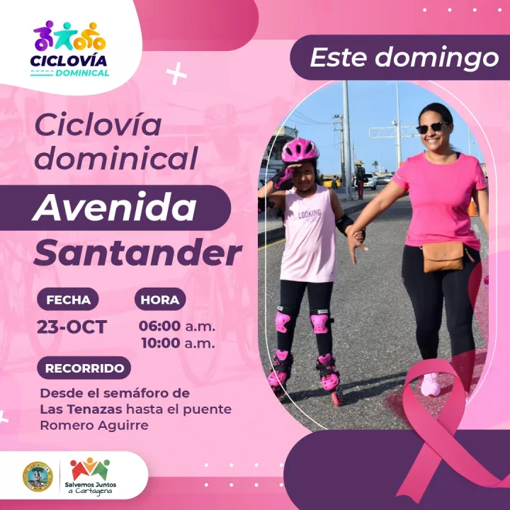 En lo que va del año se han realizado diez ciclovías, tanto en la avenida Pedro de Heredia como en la avenida Santander, con el fin de brindar un espacio lúdico y deportivo que promueve el adecuado uso del tiempo libre y está dirigida a toda la población. La ciclovía del domingo 23 de octubre estará enfocada en la prevención del cáncer de mama.