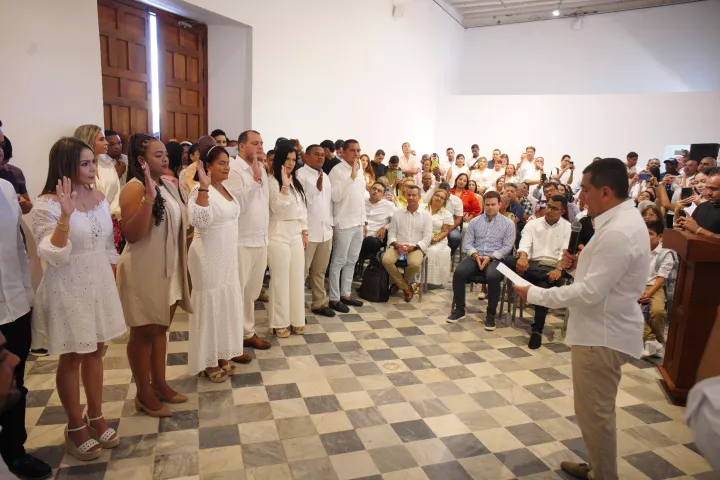 Cartagena de Indias, 02 de enero de 2024. Con la presencia del alcalde mayor de Cartagena, Dumek Turbay Paz, se llevó a cabo en el Palacio de la Inquisición la posesión de los ediles de las Juntas Administradoras Locales (JAL) del Distrito de Cartagena, para el periodo 2024 - 2027, conforme con el Acuerdo Ley 136 de 1994.