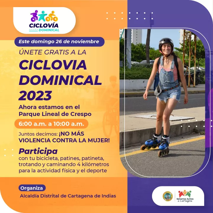 La ciclovía dominical se desarrollará mañana, 26 de noviembre, desde la 6:00 hasta las 10:00 de la mañana y es posible mediante el trabajo articulado de la Gerencia de Espacio Público, el Departamento Administrativo de Tránsito y Transporte - DATT, Secretaría de la Mujer, Transcaribe, Distriseguridad, ESE y DADIS.