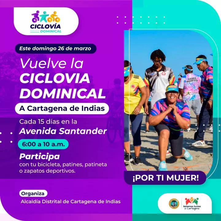 Cartagena de Indias D.T. y. C; 24 de marzo de 2023. Nuevamente, la Avenida Santander se convertirá en un gran parque lineal frente al mar, al acoger la Ciclovía Dominical, la cual tendrá un enfoque en la conmemoración del Mes de la Mujer y la lucha Contra el Cáncer de Cuello Uterino.