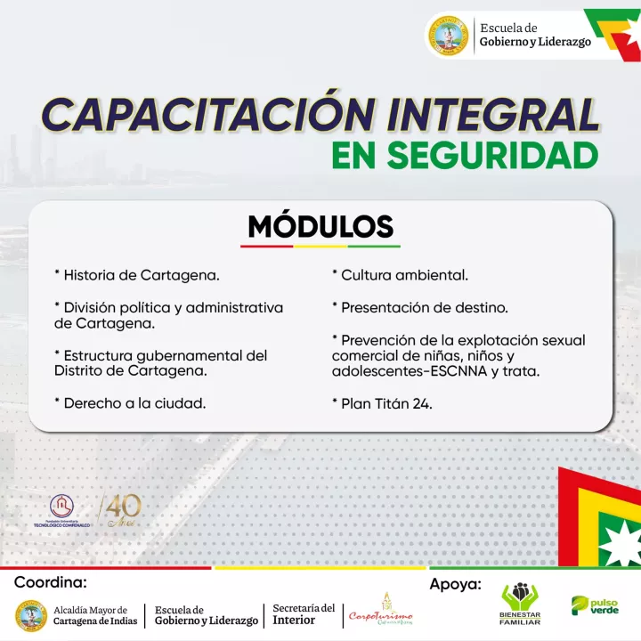 La capacitación se llevará a cabo de la mano de Secretaría del Interior y la Corporación Turismo Cartagena de Indias - Corpoturismo, contando con el apoyo de la Fundación Universitaria Tecnológico de Comfenalco, Pulso Verde y el Instituto Colombiano de Bienestar Familiar - ICBF.
