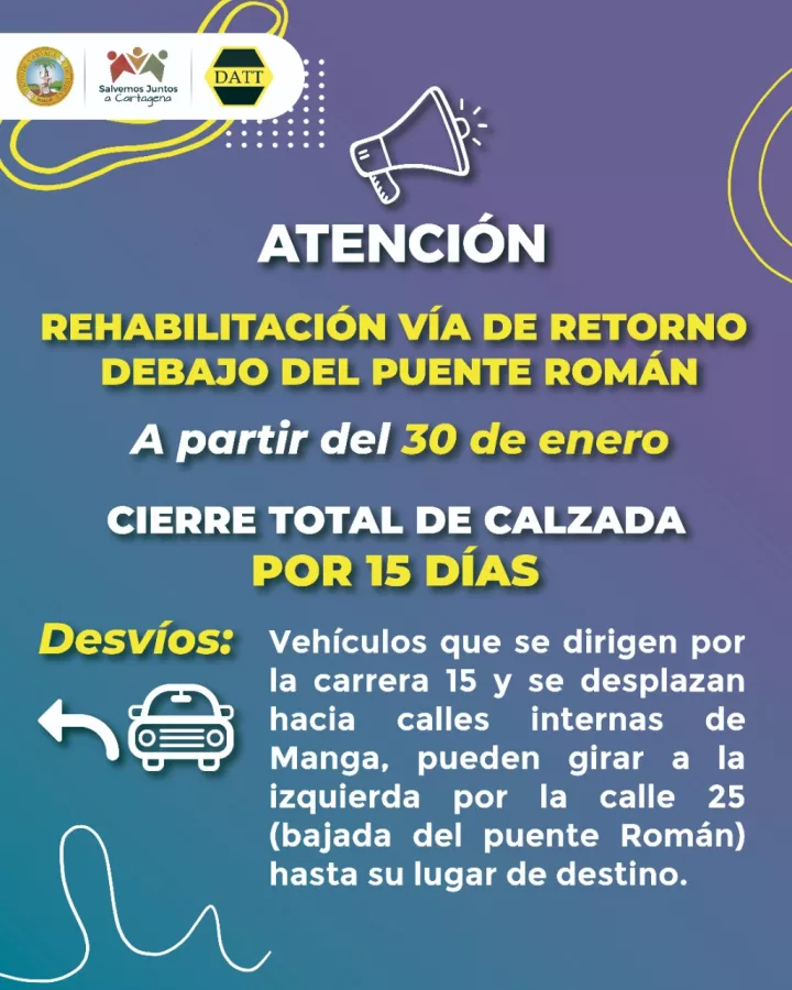 Cartagena de Indias D. T. y C; 27 de enero de 2023. Para facilitar los trabajos de rehabilitación programados por el Gobierno Distrital en la malla vial del Puente Román y sus accesos, a partir del lunes 30 de enero se restringe el tráfico vehicular por la calzada de retorno que comunica con las calles internas del barrio Manga.