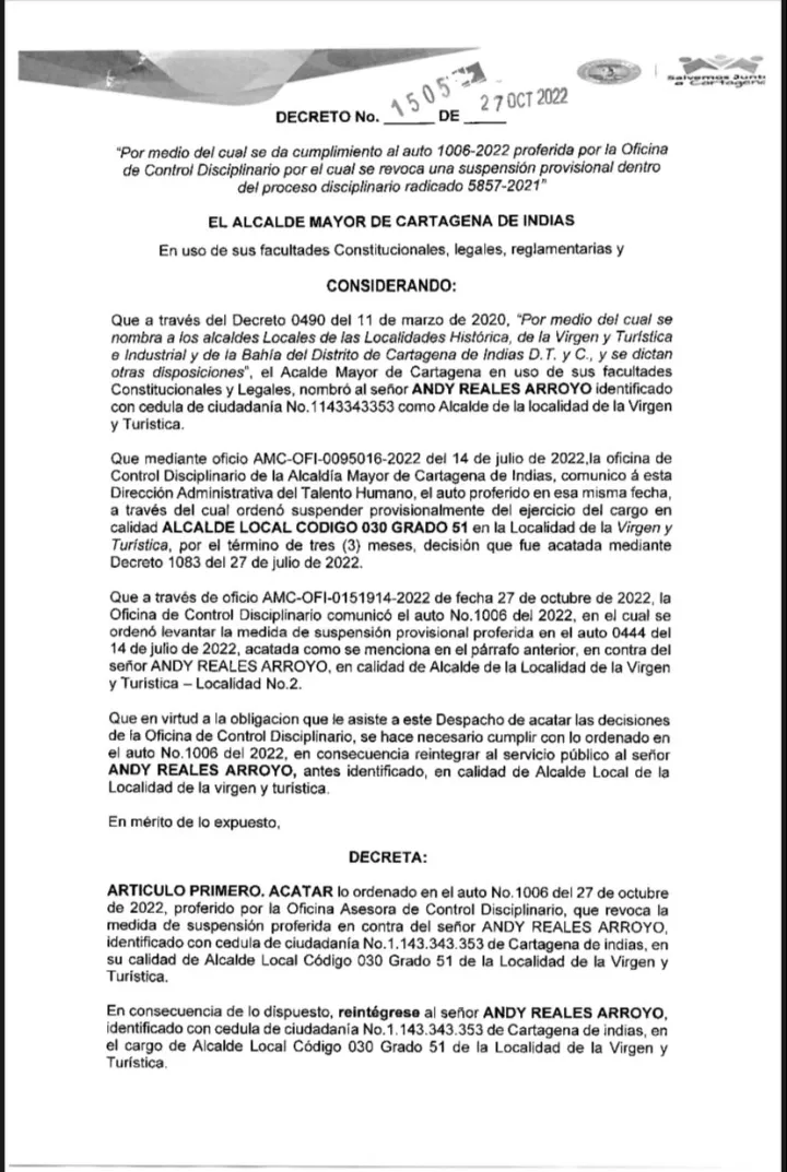 Cartagena de Indias D.T y C., 31 de octubre de 2022. La Oficina Asesora de Control Disciplinario de la Alcaldía de Cartagena ordenó revocar la medida de suspensión provisional que fue proferida en contra del señor ANDY REALES ARROYO en su calidad de Alcalde Localidad de la Virgen y Turística de Cartagena, a través de auto numero 1006 del 26 de octubre de 2022.
