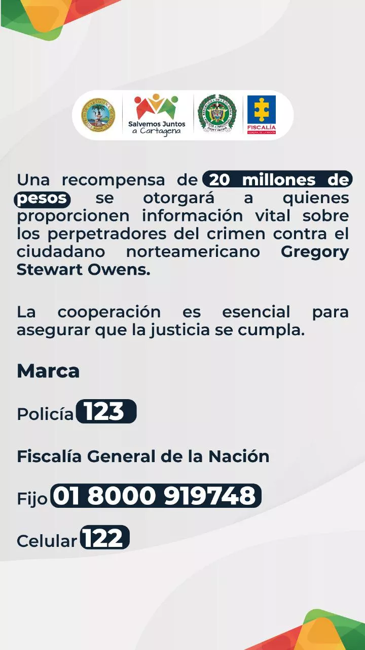 Cartagena de Indias, D. T. y C. 20 de octubre de 2023 El Alcalde de Cartagena, William Dau Chamat, expresa sus condolencias a la familia y seres queridos del ciudadano norteamericano Gregory Stewart Owens, quien falleció ayer, jueves 19 de octubre, en esta ciudad, al intentar defenderse de un atraco.
