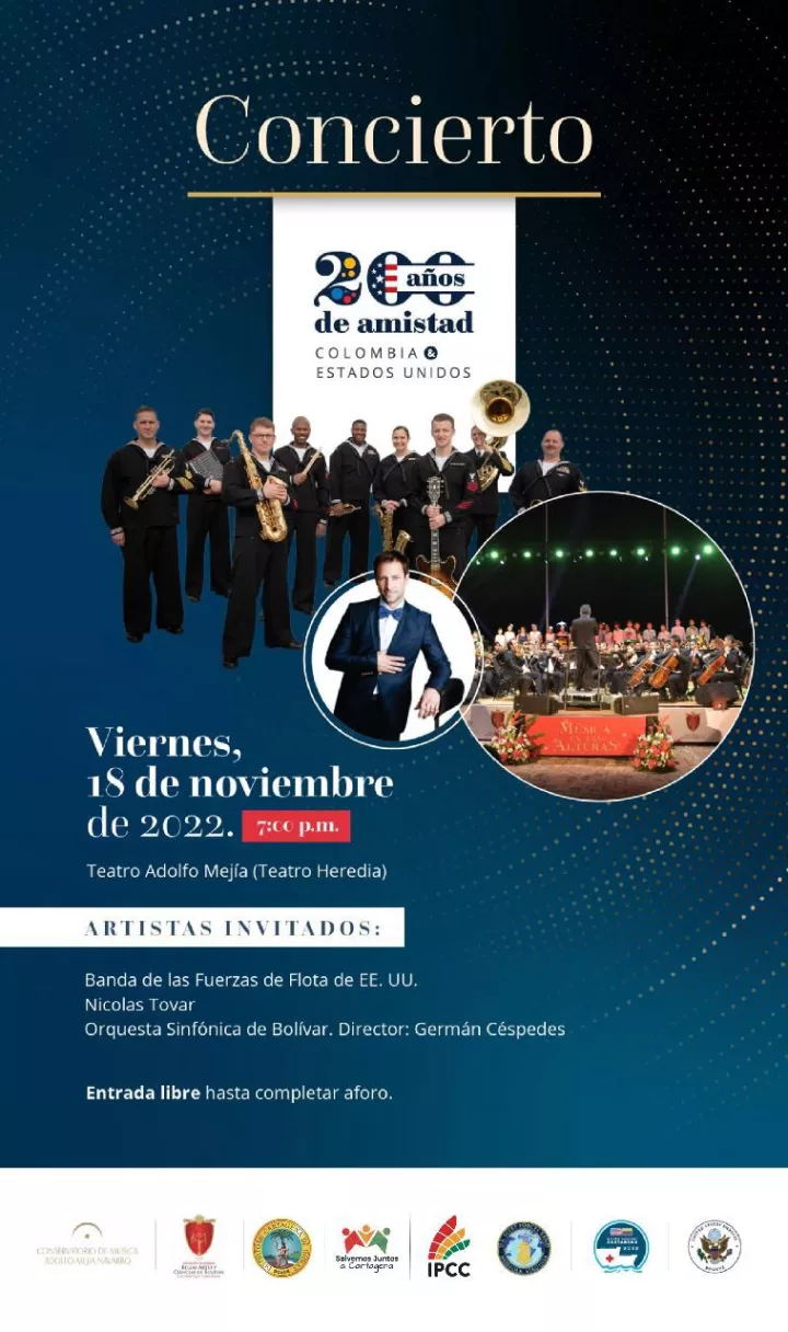 Cartagena de Indias D. T. y C., 18 de noviembre de 2022. El telón del Teatro Adolfo Mejía se subirá nuevamente desde las 7:00 de la noche para ofrecer a los ciudadanos y visitantes una muestra musical con la Banda Comfort - Fuerzas de la Flota de EE.UU, el músico Nicolás Tovar y la Sinfónica de Bolívar.