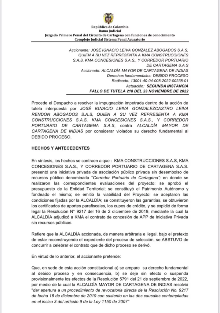 Cartagena de Indias D.T. y C., 30 de noviembre de 2022. El Juzgado Primero Penal del Circuito de Cartagena con Funciones de Conocimiento confirmó en segunda instancia el fallo del 10 de octubre de 2022 del Juzgado Octavo Penal Municipal de Cartagena, que declaró improcedente la tutela instaurada por KMA Construcciones, con la cual buscaba dejar sin efecto la resolución que revoca la adjudicación de la APP Corredor Portuario.